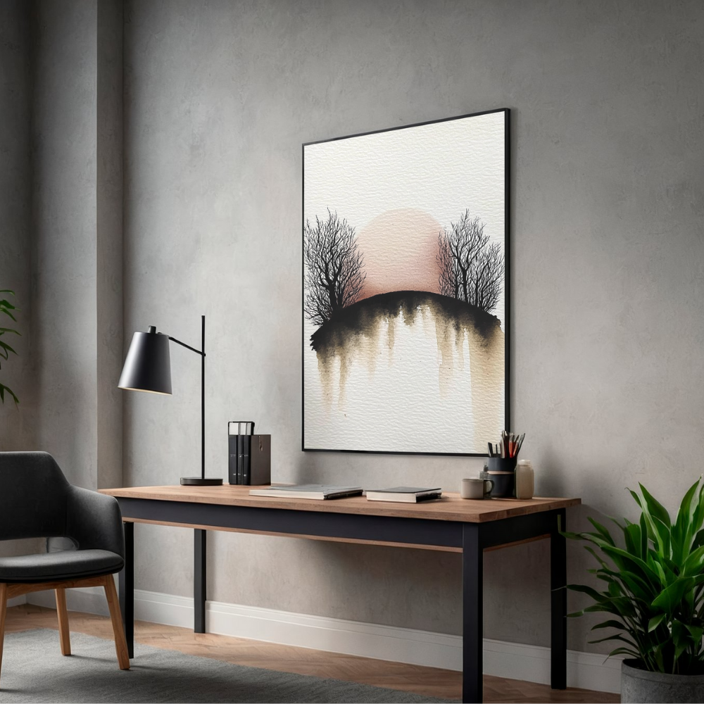 This minimalist watercolor artwork captures a serene moment at dusk, featuring two delicate tree silhouettes standing against a soft red sun. The gentle downward wash of watercolor adds warmth, depth, and a calming organic texture—perfect for cozy bedrooms, living rooms, or meditation corners.